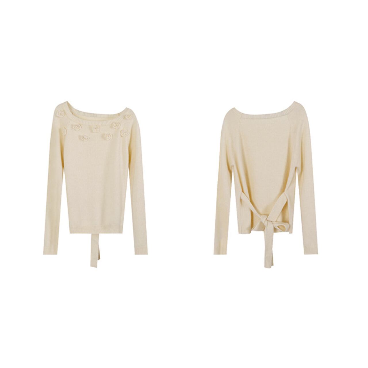 甘さを抑えた立体感が、大人の女性らしい華やかさを演出するニットトップスです。