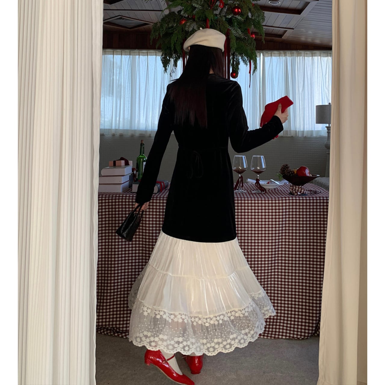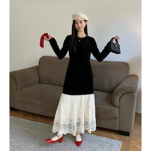 スカート部分は軽やかなレースを重ね、歩くたびに柔らかく揺れるデザインに。
